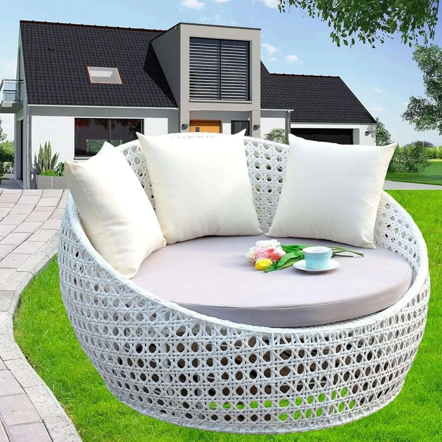 The most stylish rattan wicker furniture gives your garden a new look. Our patio rattan daybed includes one round lounge chair and a waterproof cushion. With its modern and upscale design, It will highlight your outdoor living space. The patio daybed is made of high-quality HDPE rattan and a powder-coated iron frame to provide stability and durability. Moreover, it comes with soft, waterproof cushions and cozy pillows to ensure softness and a comfortable seating experience. It comes with a cushion That is made of water-proof and sun-resistant fabric, so the daybed can protect you from sunlight.